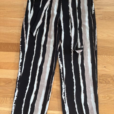 Størrelse 36. Mange av buksene har smal passform. Buksene er i sort, mørkeblå, lys.