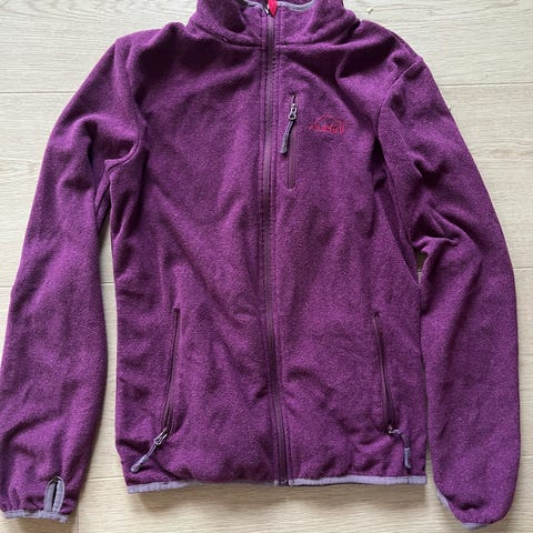 Vikafjell fleecejakke i størrelse L for dame. Jakken har en rosa farge med glidelåslommer og glidelås i front. Materialet er mykt og egnet for utendørs bruk eller som et isolerende lag.