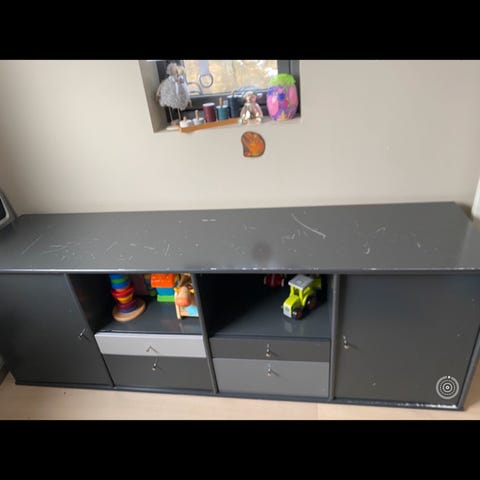 Bordet er brukt som utstilling i butikk. Noe slitasjemerker og et hjul som fikses om man vil trille det. Men om det skal stå i ro, som sofabord feks, er det null stress.