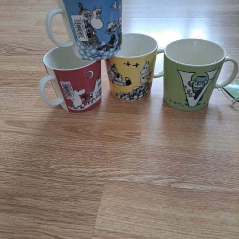 Arabia Mummi krus sett med 5 forskjellige motiver. Krusene er laget i porselen og har fargerike illustrasjoner av Mummifamilien og deres venner. Passer til daglig bruk til drikkevarer som kaffe og te.