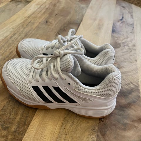 Adidas innesko/joggesko/gymsko i størrelse 33, Skoene er hvite med svarte detaljer og har lys gummisåle.