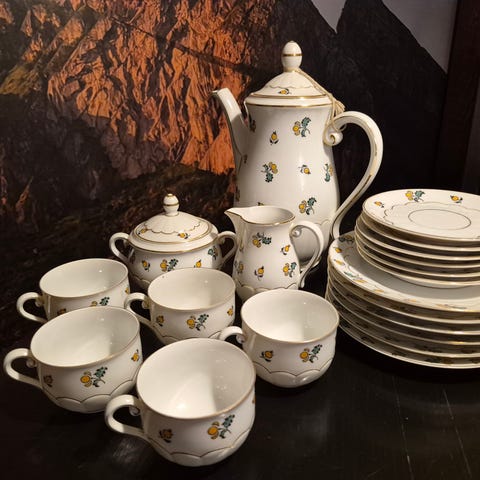 12 asjetter, tefat og kaffekopper. Fløtemugge og sukkerskål.