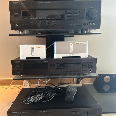 Yamaha Surround System høyttalersett bestående av flere høyttalere og subwoofer. Settet inkluderer en receiver og separate høyttalere med tilkoblinger for surroundlyd. Farge svart. Passer til hjemmeunderholdning og lydsystemer.