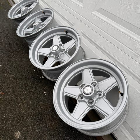 Lufter mine Brock B1 felger for salg. 10x17 et20 med boltsirkel 5x112. Center dim er 73,1. Er med sentrerings ringer for 57,1. Er lakkert opp en gang i tiden i noe mørkere grå enn org farge, se bildet med felgen som har nav dekselet på plass. Nav deksler er ubrukte, og har nye merker, men merkene er av to forskjellige typer, se bilde. Noen bruksmerker finnes, men det er lakk skavanker, se bildet av felgen med to korrosjom flekker på kanten, ellers ingen større skader. Dette er felger som fyller breie hjulhus. Kan brukes som de er, eller enkel restaurering med ønsket farge for å få et pent felgsett
