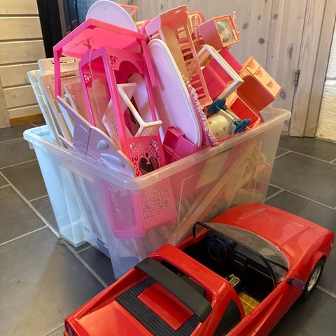 Barbie ambulanse leketøysbil med hvit og rosa farge, dekorert med medisinske symboler.