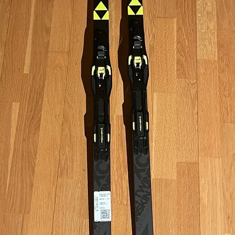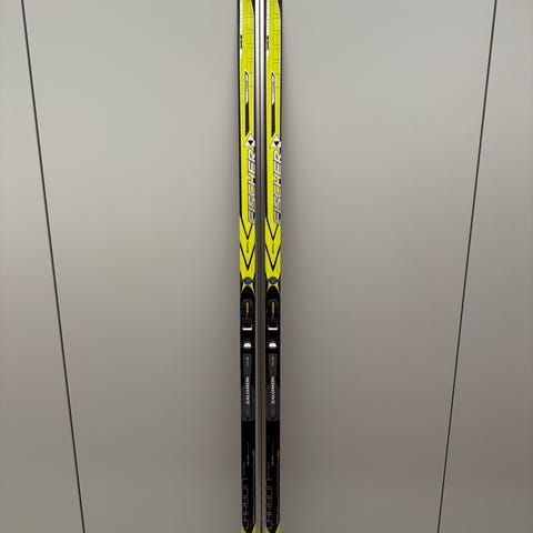 Fischer Twin Skin Comp langrennsski. Skiene har svart og gul farge og er laget for bruk i klassisk stil.