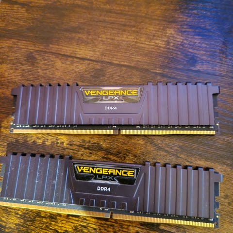 Selger et pent brukt 16 GB sett med Corsair Vengeance DDR4-minnebrikker (2x8 GB, 3200 MHz, CL 16-18-18-36) etter oppgradering.