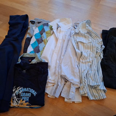 Pent brukte klær i str 122-128. 9 bukser, 5 gensere, 1 singlett, et skjørt og en sommerkjole. Ikke hull eller slitasje. Kommer fra et røykfritt og dyrefritt hjem.