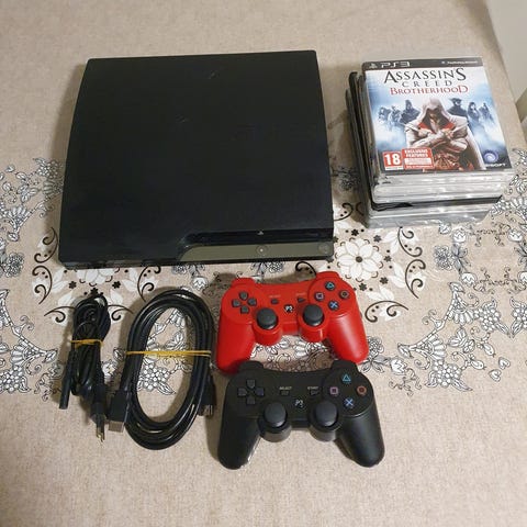 Sony PlayStation 3 spillkonsoll inkludert flere spilltitler som FIFA, Ratchet & Clank, The Adventures of Tintin, og andre. Konsollen er svart og leveres med kontroller. Spillene dekker ulike sjangre og gir variasjon i spillopplevelsen.