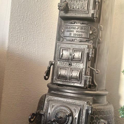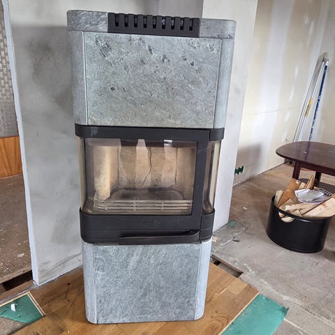 Pen klebersteinsovn / klebersteinspeis med Contura peisinnsats med sideglass.