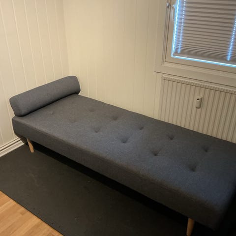 Lekker sjeselong i turkis (fargen kommer ikke helt frem på bildene). Den har stått på et gjesterom og er nesten ikke brukt.