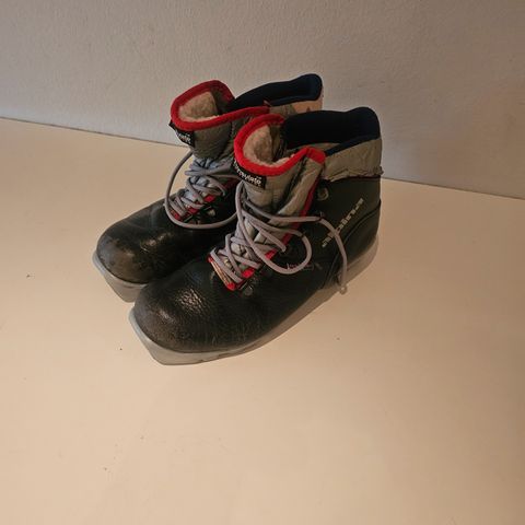 Alfa skisko, blå. Litt usikker på størrelsen, antar str 37-38. Skinn. Kr. 200.