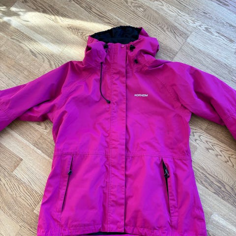 Jakka rosa farge, størrelse XL for kvinner. Jakken har hette, snøring i midjen og flere lommer. Egnet for bruk som ytterjakke i kjøligere vær.