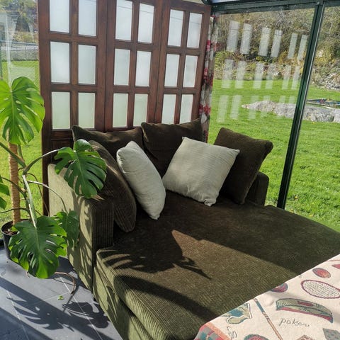 Den er lett å flytte rundt på grunn av sin lave vekt. Den kan flyttes rundt av én person, og man kan dermed lett variere plassering. Den er kul både inntil vegg og midt i et rom, pga de fine detaljene på siden og bak. Men, siden den er lett, står den mindre stødig enn en tung sofa. Vi bor i et eldre hus, der gulvet ikke er helt jevnt overalt. Derfor har Hadley ikke stått like stødig alle steder i stuen. Men det har løst seg fint ved bruk av beskyttelsesputer under bena. Som man jo uansett bruker.. 😊