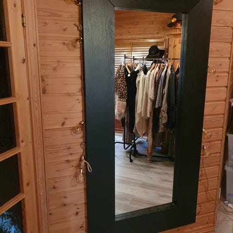 Stort fint speil med en super fin svart ramme: Husker ikke helt høyde men tror rundt 180cm høyt. Får ikke satt det opp på høykant fordi lageret er ikke så høyt i tak høyde😅 pris kan diskuteres