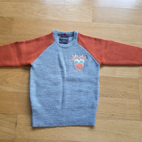 Jotunheim ull genser og bukse i størrelse 110 for barn. Plagget er i grå farge og laget av ullmateriale. Designet for unisex bruk. Et lite hull i ytterste ullag på det ene beinet. Ikke hull igjennom.