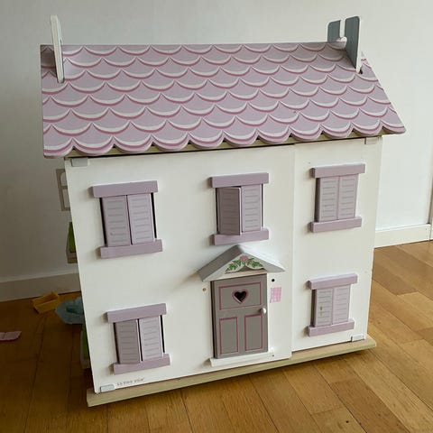 Dukkehus i tre med to etasjer og loft fra Le toy van. Møblene følger med. Småmerker her og der.