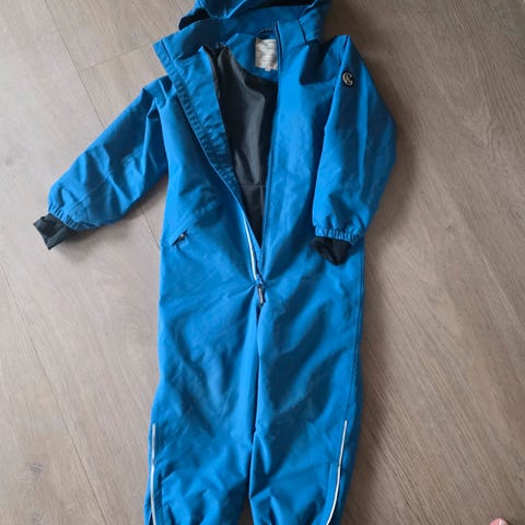 Blågrå Gullkorn vinterdress med avtakbar pelskant (fuskepels) i størrelse 122cm selges. Den er brukt en sesong. Det er noe slitasje på rumpa og kner, se bilder. Fremstår for øvrig i god stand.