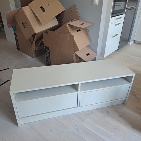 Pent brukt, og veldig praktisk, plassmontert TV-benk og bokhylle. Består av en TV-benk av fire store dype skuffer og to doble glassdører, i tillegg til en bokhylle på siden og over, med justerbare hyller. TV-en på bildet er 70 tommer.