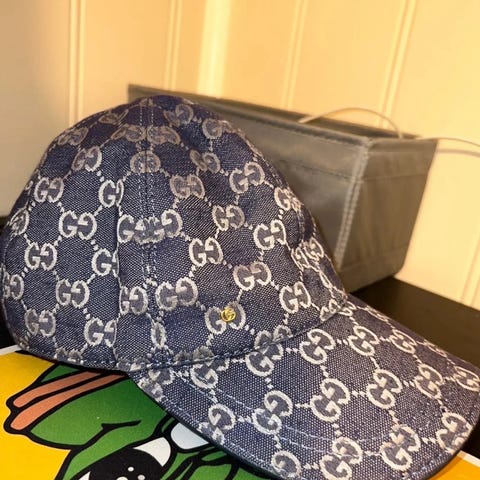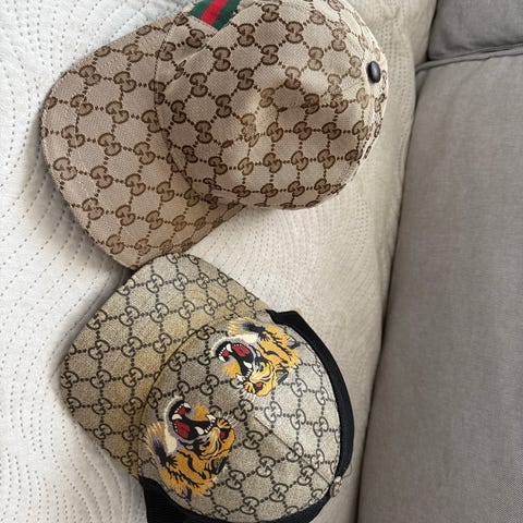Gucci cap i beige farge. Passer herre i størrelse S med justerbar bakre stropp for tilpasning. Mønster med GG-logo og dekorativ stripe foran.