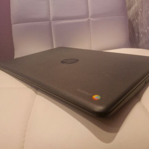 HP Chromebook laptop med sølvfarget chassis. En bærbar datamaskin designet for bruk med Chrome OS, egnet for nettbaserte oppgaver og lett kontorarbeid.