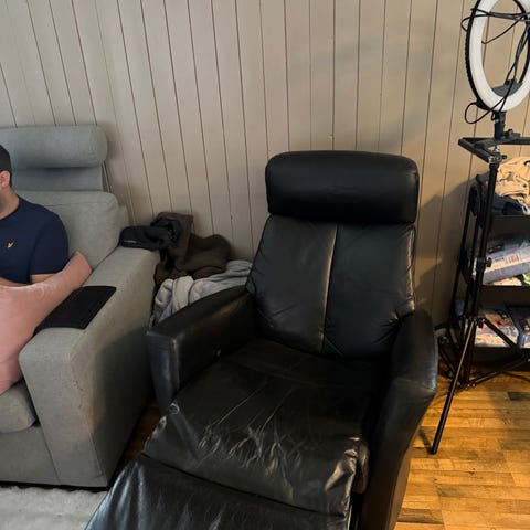 Fantastisk god stol å sitte i. Ryggen kan justeres langt tilbake. Sovner lett i denne.