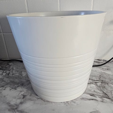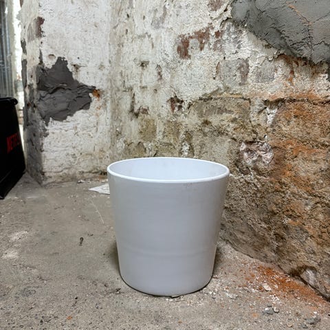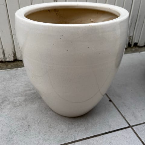 Hvitt keramisk blomsterpotte med riflet overflate. Passer til innendørs planter og kan brukes som dekorativ potte for ulike typer planter.