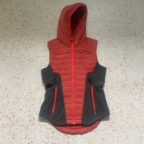 Johaug vest for dame i størrelse XL. Vesten har en kombinasjon av rødoransje og svart farge, med hette og glidelåslommer. Egnet for langrenn og andre aktiviteter.