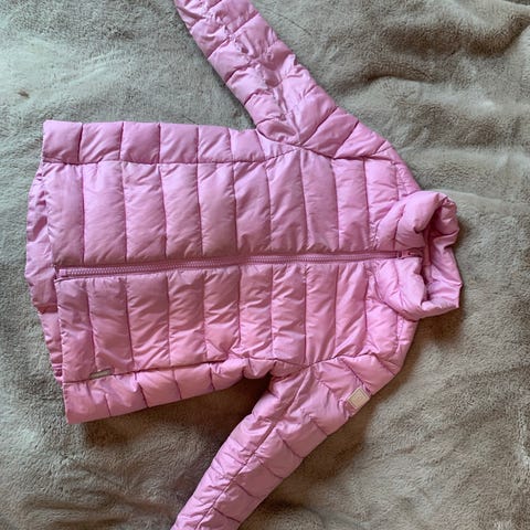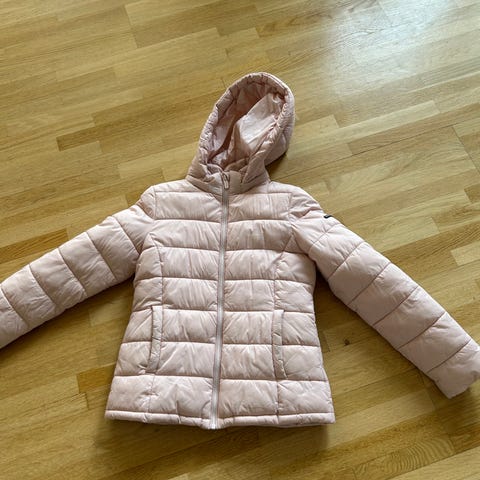 Rosa lett dunjakke i str 170. Jakken har en bitteliten rift, se siste bilde. Selges derfor rimelig.