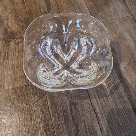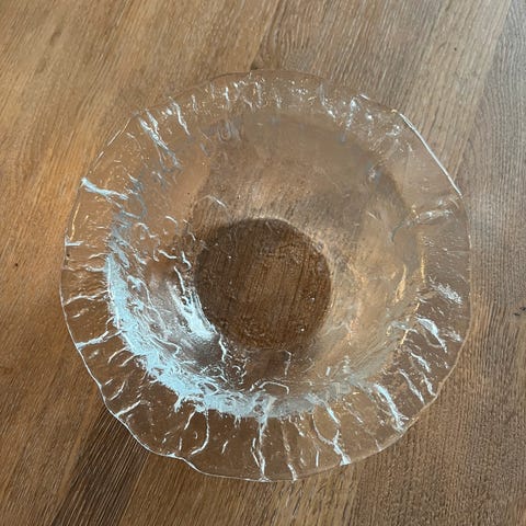 Magnor Glassverk glassbolle med dekorativt mønster, laget i klart glass. Egnet som pynt eller til servering. Diameter. 28 cm.