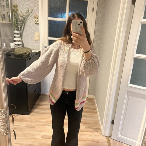 Hjemmestrikket cardigan i fin alpakkaull. Nydelig å ha en kjølig sommerkveld.