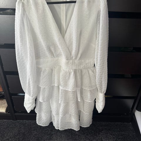 En feminin kjole med korte puff-ermer, knappelukking foran og innsvinget midje som gir en flatterende passform. Skjørtet faller lett med en diskret volang nederst. Like fin til hverdags med sandaler som til fest med hæler og smykker.