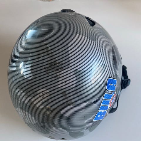 Bula hjelm i str 52 svart med mønster. Hjelmen har ventilasjon og justerbar hakestropp, egnet for bruk ved aktiviteter som krever hodebeskyttelse.