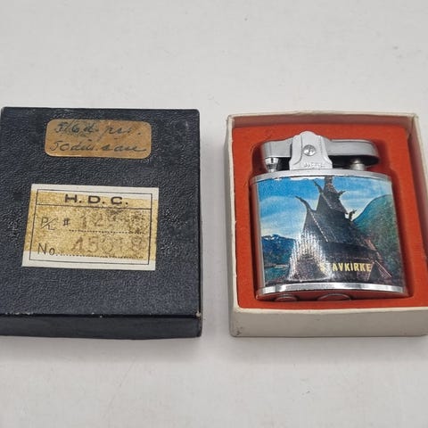 Et pent og tidsriktig samlerobjekt, velegnet for samlere av fyrstikker, reklameartikler og nordiske suvenirer. Ekstra pluss at både etui og fyrstikkeske følger med.