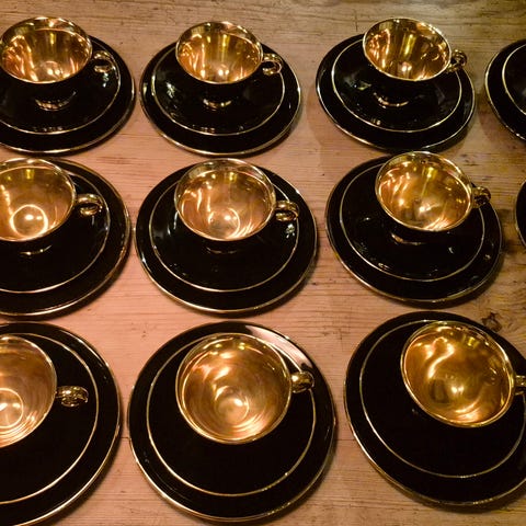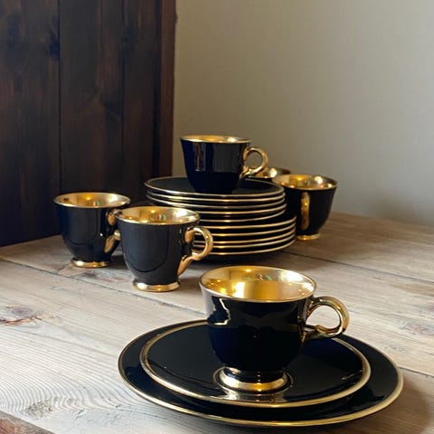 Svart og gull kaffekopper med tilhørende skåler fra Stavanger Flint, 5 kuverter. Kan sendes mot porto.