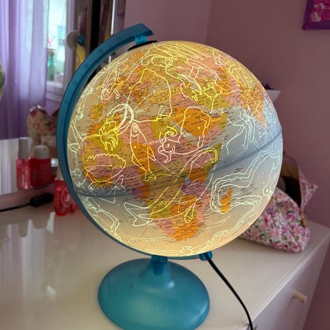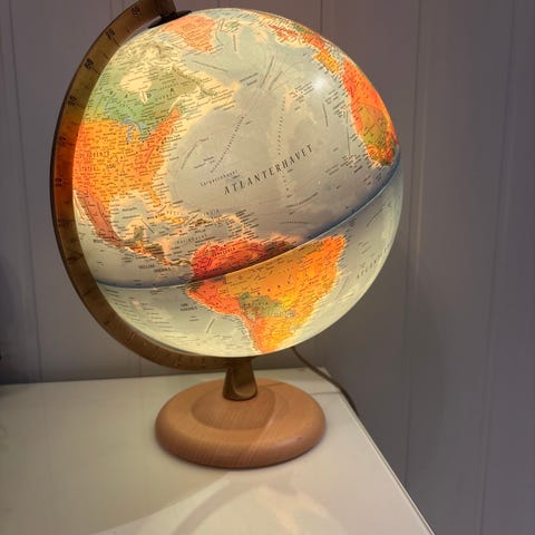 Pent brukt globus med stjernehimmel når lyset står på. Ca. 80 cm i omkrets