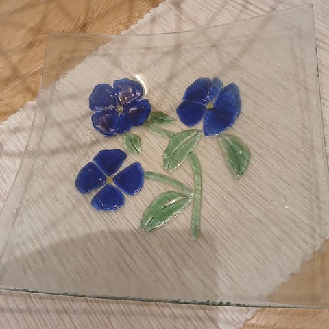 Glassfat i klart pressglass med bølget, perlet kant og oransje/amberfarget dekor i stiliserte blomster/blader. Fatet har et dekorativt mønster og gir et retro/vintage preg. Passer som serveringsfat for kaker, dessert eller frukt, pyntefat eller interiørdetalj i retro eller klassisk stil. Antatt fra tidlig til midten av 1900-tallet. Fatet er i hel og pen stand .Kan sendast.Størrelse 28 x 35.