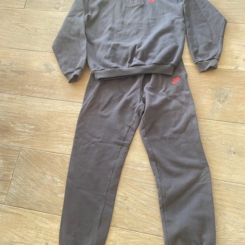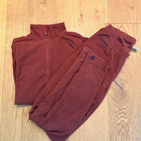 Lett og tynn fleecegenser og bukse i størrelse 134/140. Pen brunfarge. Genseren med glidelås i front og både genser og bukse har hvite kontrastsømmer. Egnet til ulike aktiviteter.