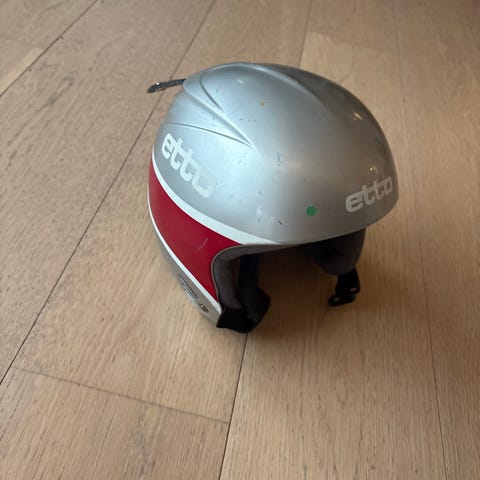 Etto skihjelm str 54 med svart og rød farge. Hjelmen har justerbar stropp under haken og er designet for å gi hodebeskyttelse ved vintersportaktiviteter.