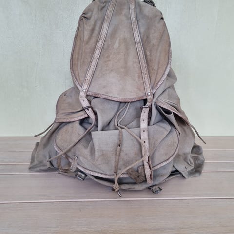 Vintage kraftig lerretsryggsekk med lærdetaljer og indre metallramme. Hovedrom med snøring, overskylning med luke og lærreimer, to små sidelommer og en stor frontlomme. Sekken har bruksslitasje og patina, men ingen skader som svekker funksjonen (se bilder). Ingen synlige merker/etiketter for produsent — antatt militær eller feltsekk fra mid-1900-tallet.