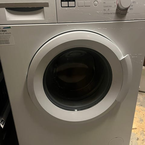 Bosch frontmatet vaskemaskin med standard hvit farge. Maskinen har et brukervennlig kontrollpanel med dreiebryter for valg av vaskesykluser. Egnet for vanlig husholdningsvask.