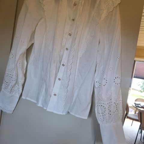 Utrolig fin dongerifarget peplum-bluse med volanger. Nydelige broderidetaljer. Luftig og lett til sommeren. Kjøpt på Finn, men ikke brukt den selv.