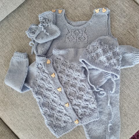Strikket babysett Str 0-2 mnd 50/56 Kan strikkes i andre farger og størrelser.