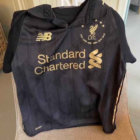 Selger 2 drakter og 2 sett med Liverpooldrakter til barn. Størrelser er avbildet. 100,- for drakt og 150,- for fullt sett. Draktene er fine og hele. Adidas med standard chartered er noe slitt, denne går for 50,-