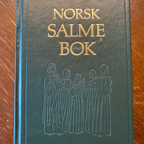 Norsk Salmebok, bok med salmer. Burgunderrød innbinding med preget tekst og illustrasjon på forsiden. Inneholder et utvalg av salmer for bruk i kirkelige sammenhenger. Som ny