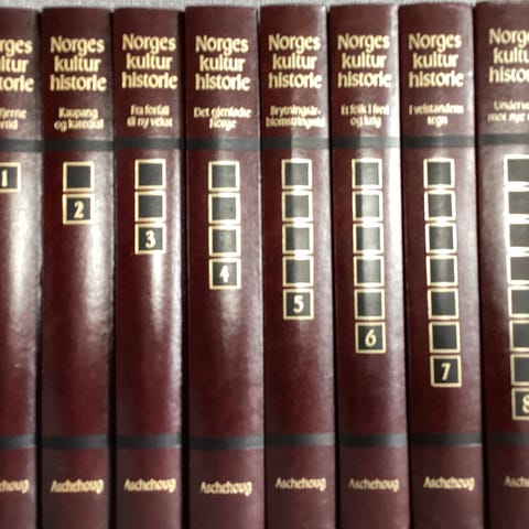 Aschehougs Vårt Folks Historie bestående av 9 bind i rødt kunstskinn. Serien dekker ulike historiske perioder inkludert forhistorisk tid, vikingtid, hellig Olavs arv og fra storhetstid til unionsstid. Utgitt av H. Aschehoug & Co. (W. Nygaard) i Oslo, 1962.