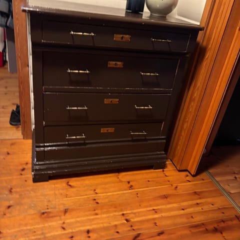 IKEA kommode i svart farge med fem skuffer. Passer til oppbevaring av klær eller andre gjenstander i hjemmet.
