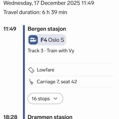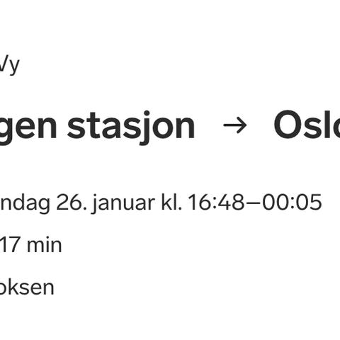 Vy Togbillett Bergen til Geilo 21.04 16:48