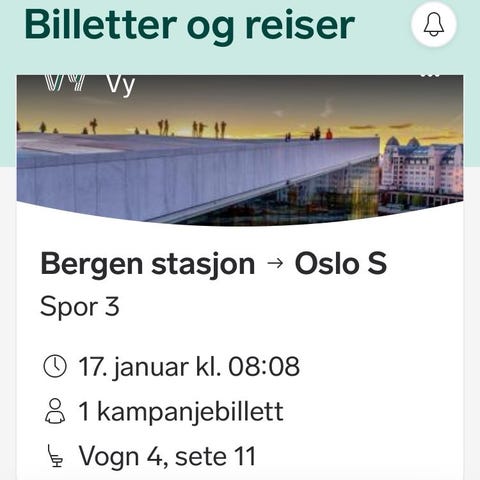 Vy Togbillett fra Bergen stasjon til Geilo, avgang kl. 16:48 21.01
