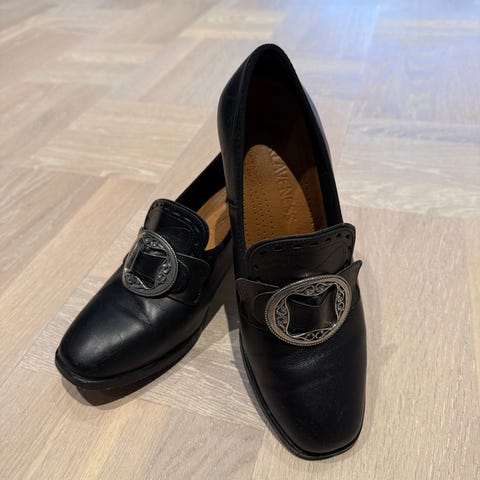 Disse fantastiske «Girl Thing»-loafersene fra Russell & Bromley / Stuart Weitzman er laget av svart ekte lakkskinn og semsket skinn. Med duskdetaljer foran. Originale gummisåler og -hæler. Helfôret i skinn. Mellomhøy blokkhæl.